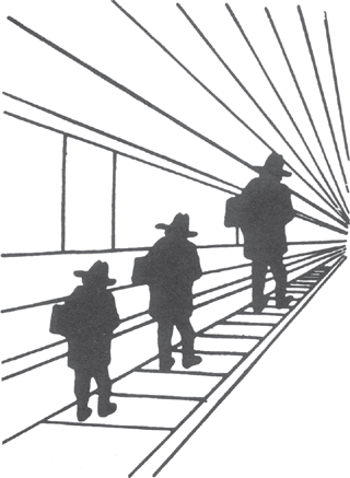 The corridor in which the figures are seen is drawn in perspective and appears to go into the depth plane. Your perceptual system automatically interprets the picture as a three-dimensional scene, not as an image printed on a flat paper surface. In the 3-D interpretation, the person on the right is both much farther away and much larger than the person on the left. For most of us, this impression of 3-D size is overwhelming. Only visual artists and experienced photographers have developed the skill of seeing the drawing as an object on the page. For the rest of us, substitution occurs: the dominant impression of 3-D size dictates the judgment of 2-D size. The illusion is due to a 3-D heuristic.