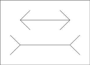 This picture is unremarkable: two horizontal lines of different lengths, with fins appended, pointing in different directions. The bottom line is obviously longer than the one above it. That is what we all see, and we naturally believe what we see. If you have already encountered this image, however, you recognize it as the famous Müller-Lyer illusion. As you can easily confirm by measuring them with a ruler, the horizontal lines are in fact identical in length.