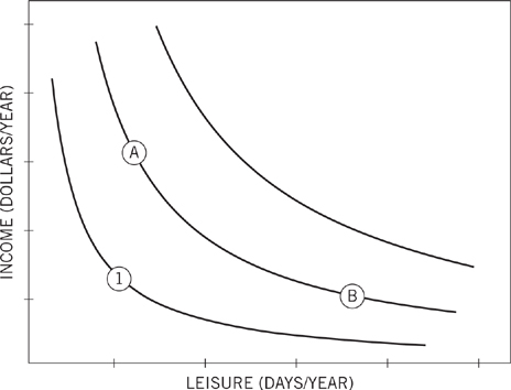 Students learn in introductory economics classes that each point on the map specifies a particular combination of income and vacation days. Each “indifference curve” connects the combinations of the two goods that are equally desirable—they have the same utility. The curves would turn into parallel straight lines if people were willing to “sell” vacation days for extra income at the same price regardless of how much income and how much vacation time they have. The convex shape indicates diminishing marginal utility: the more leisure you have, the less you care for an extra day of it, and each added day is worth less than the one before. Similarly, the more income you have, the less you care for an extra dollar, and the amount you are willing to give up for an extra day of leisure increases.