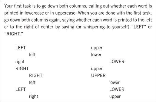 You were almost certainly successful in saying the correct words in both tasks, and you surely discovered that some parts of each task were much easier than others. When you identified upper- and lowercase, the left-hand column was easy and the right-hand column caused you to slow down and perhaps to stammer or stumble. When you named the position of words, the left-hand column was difficult and the right-hand column was much easier.